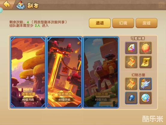 遗迹副本分为四挡开启,30级开启海岛惊魂,40级开启迷失沙漠,60级开启熔岩剑谷,80级开启幻魅古堡。非VIP玩家每天有三次进入副本的机会,VIP玩家可购买副本次数。遗迹副本前三档主要产出装备的打造和培养材料。幻魅古堡产出的材料涵盖比较丰富,包括磁翅膀、饰品及坐骑的相关材料。