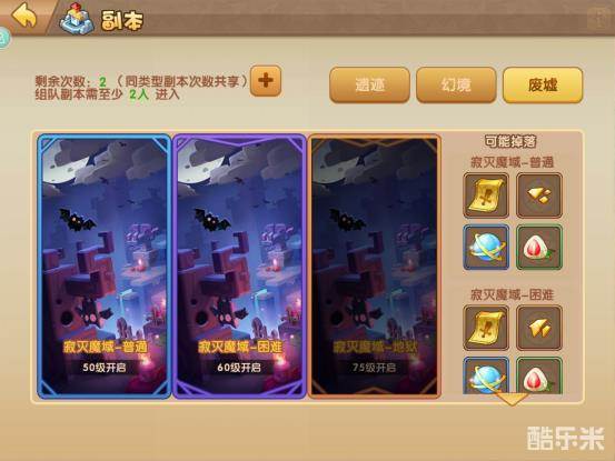 废墟副本按难度分为三挡,简单--困难--地狱,开启等级分别是50/60/75。非VIP玩家每天有两次进入副本的机会,VIP玩家可购买副本次数。前两档产出橙装打造材料及坐骑培养材料。第三档产出60级橙装打造材料和主角魂石。