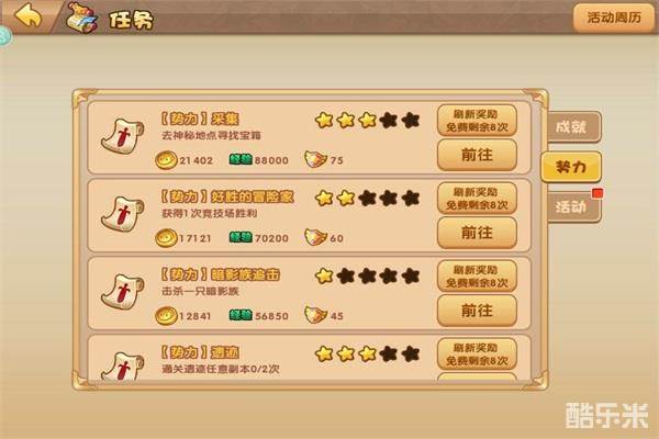 想要解锁更多的建筑,需要更多的战功提升爵位。战功可以通过野外PVP,还有完成日常的势力任务获得,任务可以刷新有概率提升星级,势力任务的星级越高,获得的奖励和战功就越丰富。