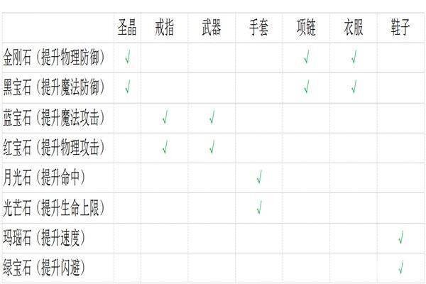 上图为每件装备可以镶嵌的宝石类型,以及不同宝石所提升的属性