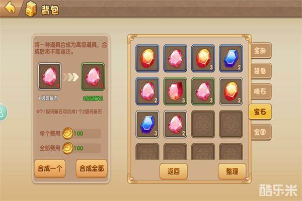 例:每4颗一级宝石可以合成为一颗二级宝石,每4课二级宝石可以合成为一颗三级宝石,以此类推。