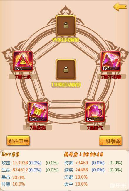 宝石:当玩家达到45级可开启宝石功能,往后随着玩家的等级上升,可佩带的宝石数将会增加。主要增加战力的宝石又称为稀有宝石,主要为攻击宝石、防御宝石、速度宝石、生命宝石。宝石可以升级,等级越高,增加的战力越多,7星宝石还可以突破,突破后增加的战力又更加惊人。可通过寻宝、VIP礼包、幸运转盘、超级幸运转盘等方式获得。