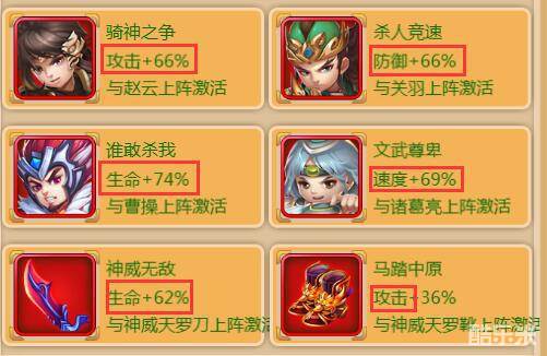情缘:每个武将都有属于自己的专属情缘,情缘由两部分组成,一是武将情缘,二是装备情缘,武将情缘只要情缘武将上阵或者在援军中即可生效。装备情缘需要武将进行一转和二转,当武将进化完成,且装备情缘装备,则可触发装备情缘。