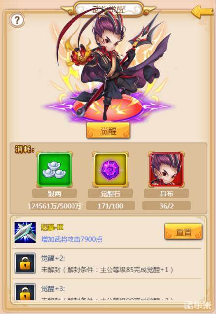 觉醒:7星以上武将可以觉醒,每个武将有三次觉醒机会,觉醒需消耗相同的武将若干个、觉醒石及银两。觉醒后可获得觉醒技能、提升战力的技能有加攻击、加防御、加生命。觉醒石可通过道具商城购买。如果觉醒等级不够高,还可以使用觉醒石进行重置喔!