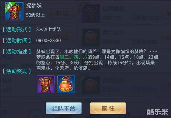 活动描述:梦妖出现了,小心他们的葫芦,那是为你编织的梦境……梦妖会在每周二、四、六的9点、14点、16点、18点、23点的整点、15分、30分,分批出现,持续15分钟。