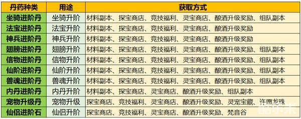 通过整理可以看出,每种丹药材料都对应了一种升阶/升级的养成点,涵盖了坐骑、法宝、神兵、翅膀、信物、仙阶、兽魂、内丹、宠物、仙侣这些的主要养成模块。而各个丹药材料的获取方式其实大相径庭,普遍都产自于材料副本、探宝商店、竞技福利、灵宝商店、酿酒升级奖励、组队副本等,比较特殊的是,宠物升级丹、仙侣进阶石不在材料副本中产出,法宝进阶丹、神兵进阶丹、宠物升级丹、仙侣进阶石不在组队副本中产出,宠物升级丹单独在灵宠宝藏中产出,而仙侣进阶石单独在梵音谷产出,正好说明了灵宠宝藏和梵音谷分别是宠物和仙侣的专属资源产出地。