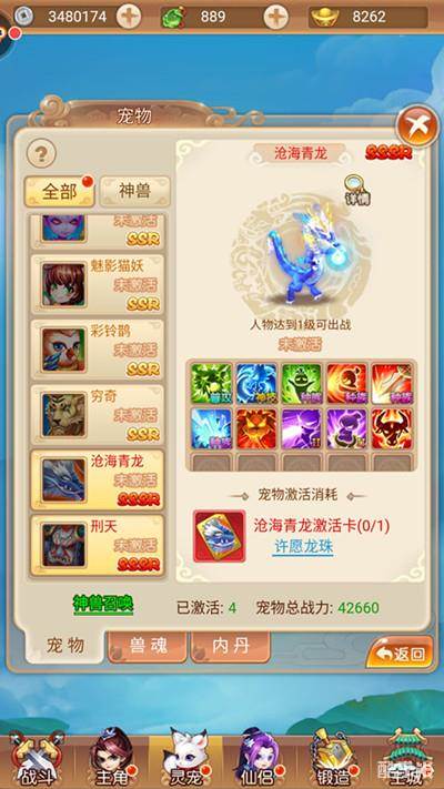 宠物分为R、SR、SSR、SSSR几种品质,首测版本中游戏内已经有30多个宠物,但其中最高品质的SSSR宠物仅有2个,沧海青龙和刑天,相比于其他品质数量明显偏少,因此也有玩家大呼不过瘾。