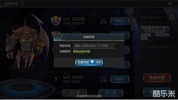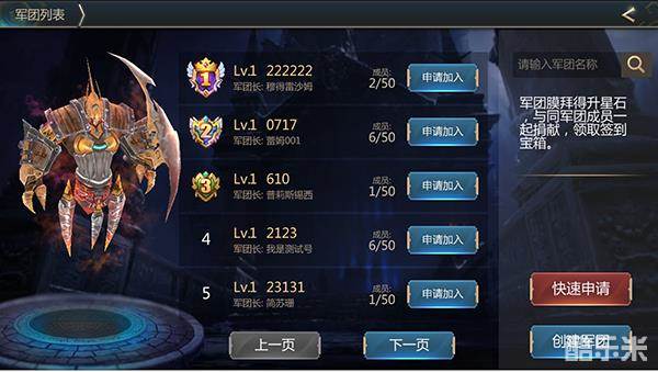 玩家可以选择加入由其他玩家创建的军团,当玩家没有加入军团时,点击军团按钮图标,就可以进入军团列表,在这个页面上,可以选择自己想要加入的军团;
