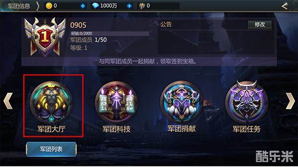 加入军团后,再次点击军团按钮图标,就可以进入到军团页面,点击军团页面上的“军团大厅”图标,就可以进入到军团大厅页面;