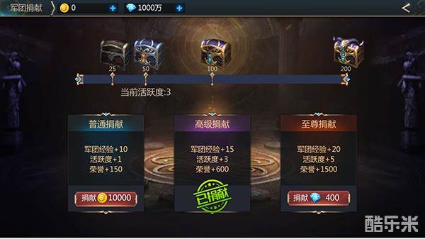 军团捐献有3档,玩家可以选择3档都进行捐献,相互之间并不影响,但是每一档每日都只能捐献一次;