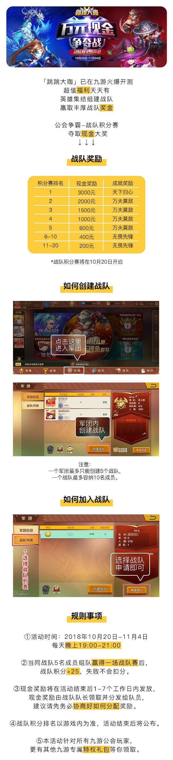 致敬经典采蘑菇游戏,轻松好玩的全新MOBA手游《跳跳大咖》已经在九游火爆开测了!群英汇聚,公会争霸,共享12100元现金。比赛期间,所有九游公会玩家组队参加战队积分赛,并且积分获得第一即可获得3000元现金奖励,第二名可获得2000元现金奖励......战队积分前20名均可获得现金奖励!还有众多专属特权礼包及现金福利等着你~
