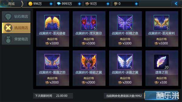 在挑战商店中,花费战勋可以购买战翼碎片,当战翼碎片获得一定数量后,就可以合成为对应的战争之翼。