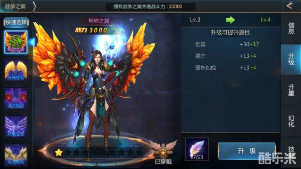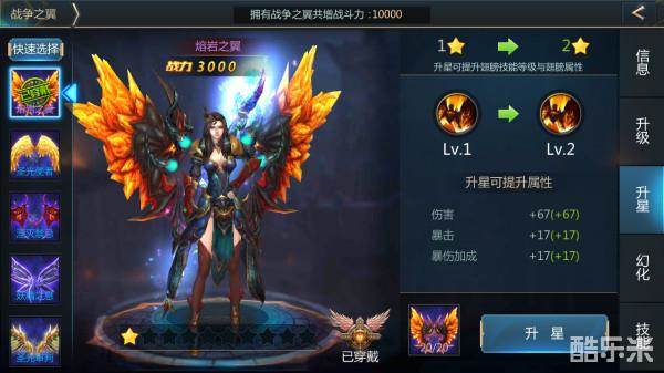 再次通过切换右侧标签页,跳转至战争之翼的升星页面,在该页面上,玩家可以通过消耗对应的战翼碎片,来为战争之翼提升星级;