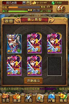同时我们也要注意到由于在卡49时我们用的大部分都是4紫霞+1白晶晶,所以每张卡牌的第二回合所用技能的攻击目标都是三个(晶晶的DEBUFF除外),因此我们不能选择目标数过少的魔神(例如只剩一到两个的,这点大家可以根据魔神血量做个大概的推断)。所以最理想的状态就是在前三回合清掉前排的怪(或者打只剩后排三个怪的魔神,这个可以根据魔神血量判断,一般在满血量的40%左右),并在第四回合干掉对面四号位,这样己方的五张卡在第四回合都打出伤害,这样的伤害就已经接近你所能打出的上限了。