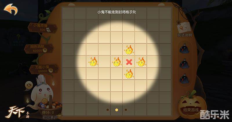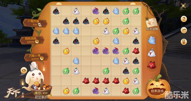 万圣节捣蛋小鬼四处逃窜?来《天下》手游“万圣连珠”活动把大荒调皮捣蛋鬼通通捉起来!集齐5枚相同小鬼,就可以……才不是召唤神龙呢!是可以成功消灭万圣小鬼呢!每移动一只小鬼,就会再度出现三只,“无色小鬼”、“炸弹”和“任意消除”等神奇道具都可以助力少侠的捉鬼之路,帮你迅速捉住小鬼!而且少侠还能获得棒棒糖和糖果罐等以此来兑换珍稀奖励,上榜少侠更有专属称谓与南瓜变身道具等至尊豪礼,快来试试你的老司机捉鬼实力吧!