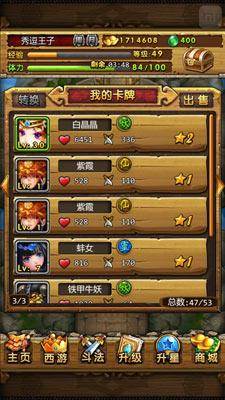 开始玩的时候不知道怎么玩,因为卡牌空间不够就把卡卖了,但是回头才发现有些卡牌是很有用的,需要得到保留,第一就是紫霞,紫霞的攻击不是最高,但是攻击的数目较多,而且也比较容易得到,在斗法、友情点抽卡、限时冲级都能得到,是性价比很高的卡,需要重点使用,特别是在卡49级时,有2个2级白晶晶、3个高级别紫霞,你就能在魔神榜上冲入前十;第二个就算是猪八戒,斗法的利器,可能很多新手斗法都不敢斗24点,但是有了猪八戒,你完全不用担心,它皮厚血多,让你斗法无忧,但是不可否认,它在神魔和副本攻击力低下的弱点;第三是孙悟空,我个人认为他是过渡卡牌,在49级前能够起到一定作用,新手很有必要前期使用孙悟空,但是不要投入过多精力,我就是将孙悟空升到10星,结果发现完全用不上到最后,孙悟空7星足矣;第四是白晶晶,它是很重要的,它的伤害加成,能够在神魔中发挥巨大作用,一定要保留,特别是它的血还很厚,后期可以作为肉盾使用。
