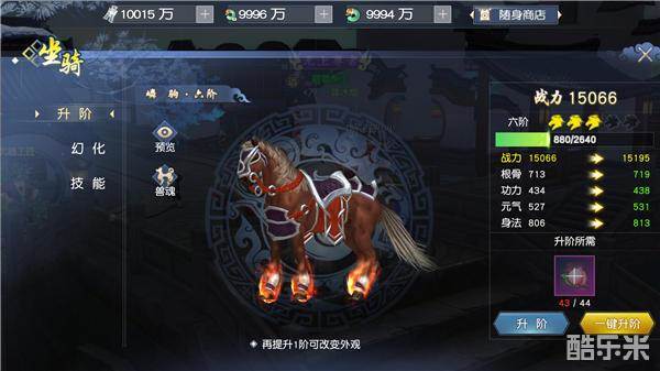 2)坐骑每次升星和升阶都会提升属性,升阶后属性会有质的飞升