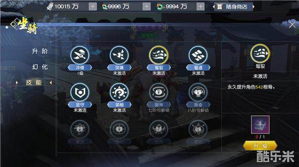 3)每个技能激活后为1级,消耗更多同样的技能书还可升级坐骑的技能等级