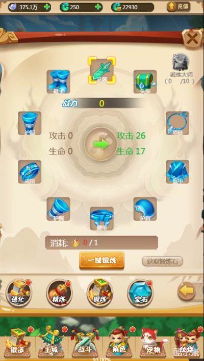 《锻炼》所需物品:锻炼石。同样在精炼的基础之上使装备更加的完美,大幅度提升战力,完成锻炼大师对防御属性明显加强。