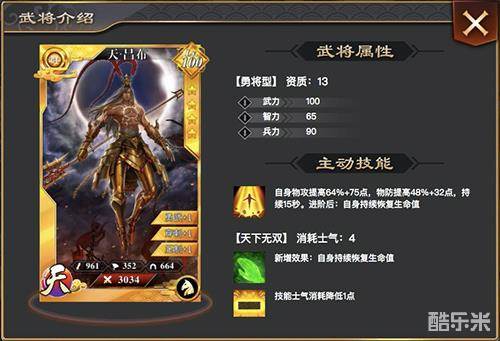 手持方天画戟,头戴耀眼金冠,专属技能“天下无双”堪称无敌:提升自身100%物攻、30%物防,持续10秒。进阶后的【天•吕布】更是战力飞起,这样的极品武将叫人欲罢不能!