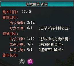 进入“珍珑棋局”副本,场景中撒落着黑白棋子,命名为幻棋,神棋。副本设有目标任务,在限定的时间内,击杀掉相应数量的棋子和珍龙之魂即可通关,同时,副本还设有特殊目标,假若能够顺利完成,奖励会更上一层楼。