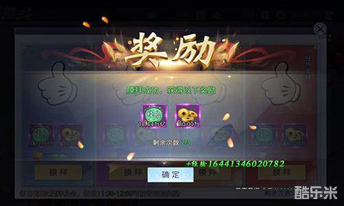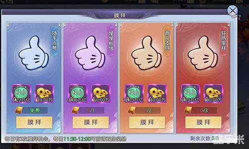 除此之外,“双倍膜拜”限时活动也是玩家获取经验值与铜币的重要途径,目前,道友们的膜拜方式共分为四种:随手点赞、惺惺相惜、鼎力支持与狂热崇拜。支持的力度越大玩家本人获得的经验值与铜钱就越多!