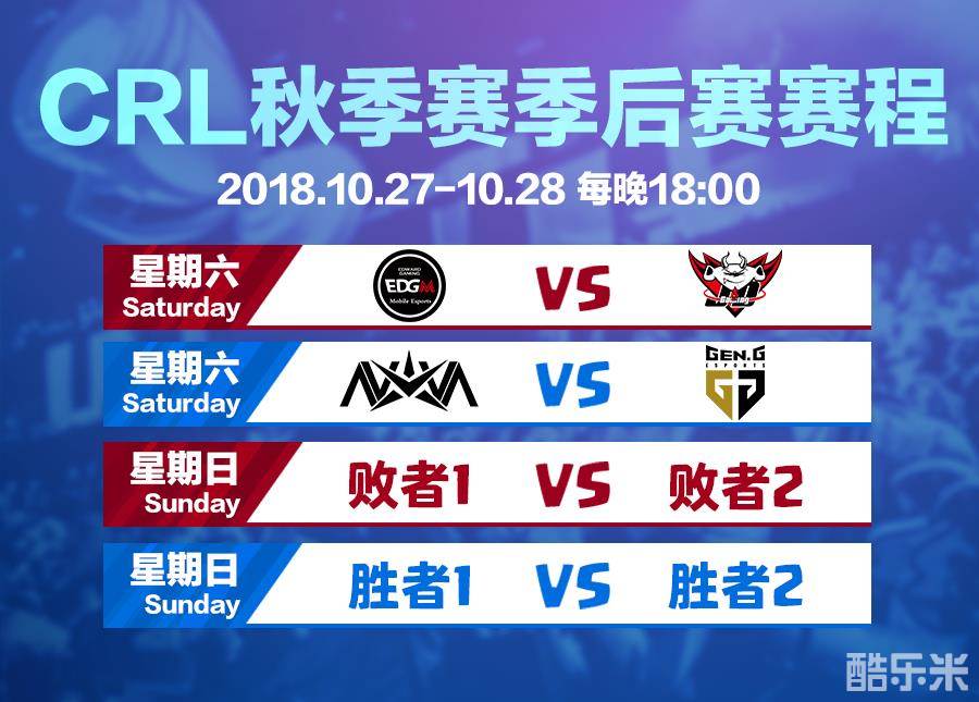 CRL秋季赛季后赛本周末激战两日,10月27日将打响两场半决赛的争夺,10月28日则将进行季军争夺战和最后的决赛,单败淘汰的赛制让比赛更加残酷和紧张,四强必须严阵以待。9周常规赛过后,卫冕冠军NOVA再度将第一收入囊中,两支新贵EDG.M和JDG紧随其后,春季赛亚军Gen.G则排名第四、压哨晋级。