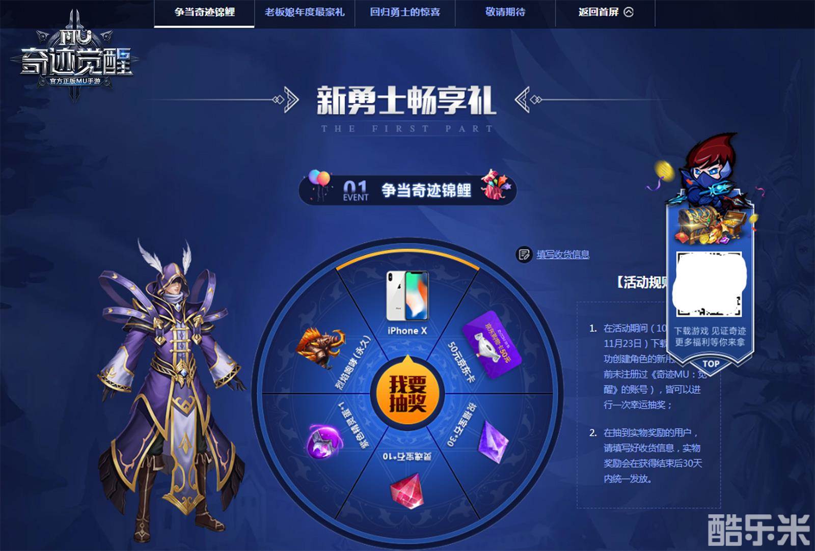 你是备受幸运女神眷顾的奇迹锦鲤吗?官宣!这里有壕礼等待着你。即日起至11月23日活动期间,下载游戏并成功创建角色的新用户(此前未注册过《奇迹MU:觉醒》的账号),均能够获得一次幸运抽奖的资格,有机会将iPhone X、烈焰咆哮(永久)、紫色精灵蛋等丰厚奖励直接收入囊中。独乐乐不如众乐乐,新勇士在注册游戏后还可以邀请好友注册游戏,将获得额外的抽奖机会。
