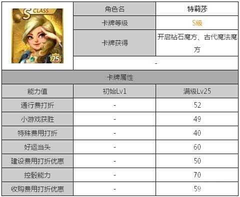 天天富翁特莉莎角色技能攻略,这个人物是今天才刚刚出来的S卡的哦,可想而知一定不会让我们失望的,下面来看看她的具体属性,到底有什么是值得我们期待的,一起来看天天富翁特莉莎角色技能。