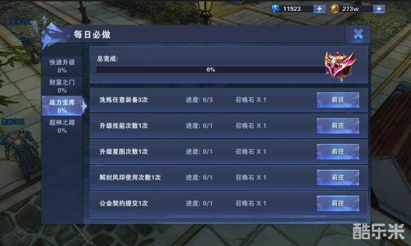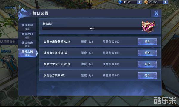 每日必做玩法共有4个强大分区:快速升级、财富之门、战力宝库、超神之路,每个区域惊喜都不一样,完成每日必做中指定的任务就能获得各种惊喜。