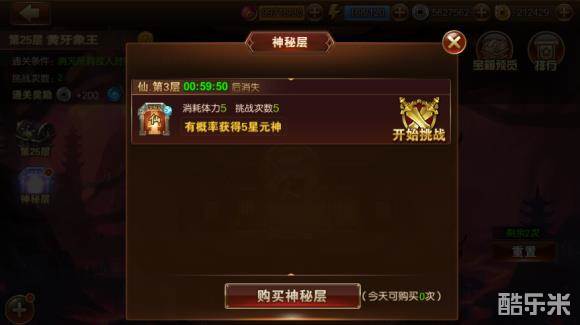 其中有些关卡还有特殊要求,比如不能超过规定回合数,神将不能死等等。爬塔时有一定几率触发“神秘层”,挑战并胜利后可随机获取稀有神将碎片。