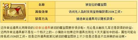 天天富翁被定位的藏宝图属性攻略,这是之后会出的幸运道具,我们提前来了解一下,满级的效果是访问无人岛的时候可以获取百分之二百的工资,是在幸运道具里面抽取得到的,很招财哦,具体的内容来看看下面的介绍。