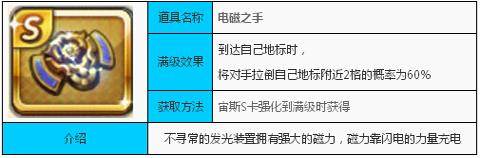 天天富翁宙斯专属道具S级电磁之手图鉴。听名字似乎十分的炫酷,可以一击必杀,扰乱对方节奏。不过也是有缺点的,他的发生不是自己能控制的,这是一个双刃剑,有时你不想它生效但偏偏生效了,有可能对对方是一击必杀但是有时可能帮了对方,这个对于各位高手们应该不难理解,因为拉到地标附近两格,而不一定是地标,那是什么情况就难说了。
