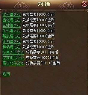 解脱境需要等级达到80级,阅历5000点,人品等级3级,可以获得解脱境之心1件;无为境需要金币1000万,转生达到1转,奖励无为境之心1件;神话境需要水晶矿石10块,救赎项链,转生达到2转,可以获得神话境之心作为奖励。