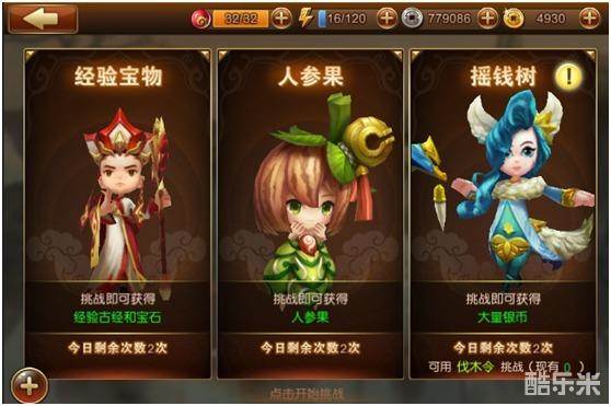 在主界面点击建筑物【试炼之地】,进入界面。试炼之地界面中包含了三类副本,包括经验宝物,人参果,以及摇钱树。