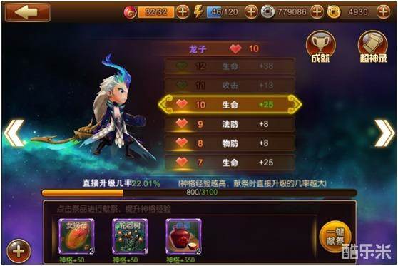 点击主界面的“超神阁”,进入超神界面。1.玩家可以神将进行献祭,提升神格等级,当神格达到一定等级,该神2.将就会获得相应的战斗属性。3.超神录中玩家可以看到玩家拥有过的所有超级神将。4.当神格等级总和达到要求的数值就会完成相应的成就。