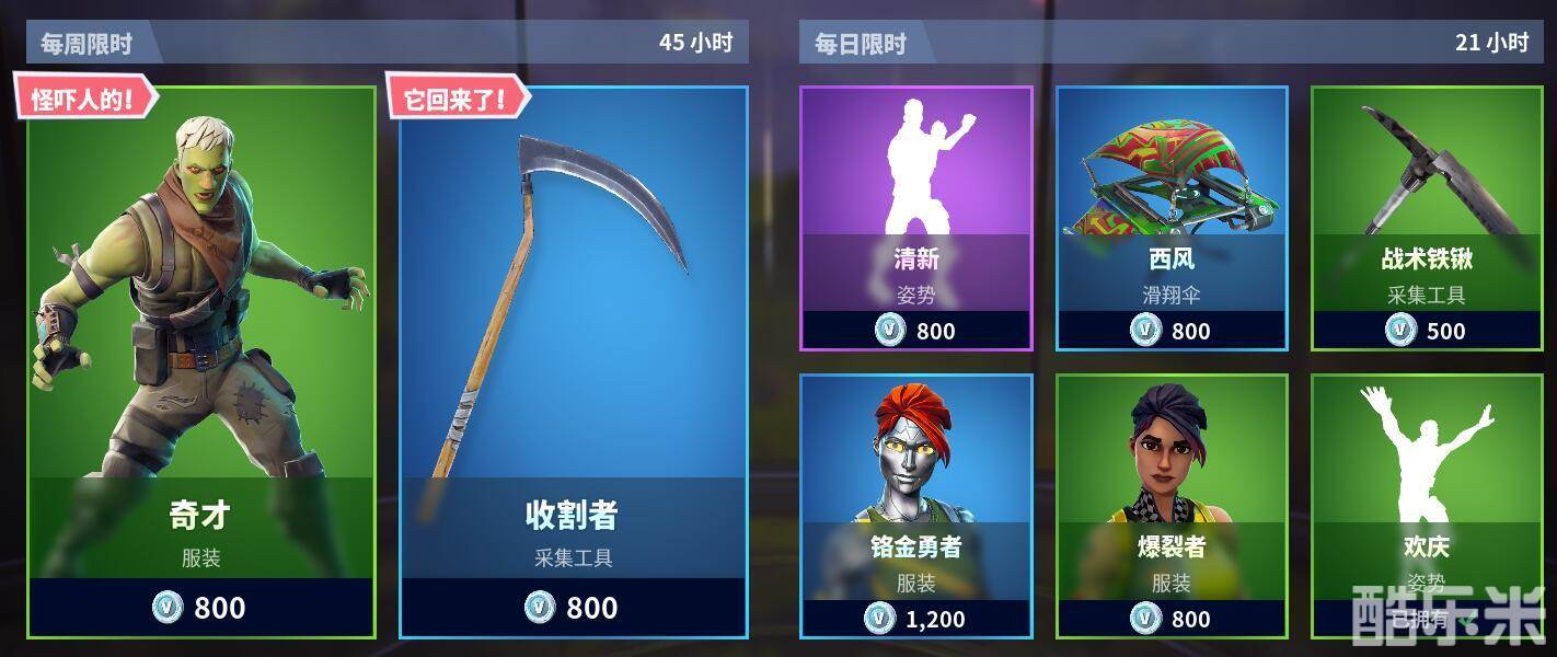 堡垒之夜10月26日每周商城上架丧尸男:奇才;老版骷髅镰刀:收割者;每日商城包含清新、西风、欢庆等皮肤姿势。