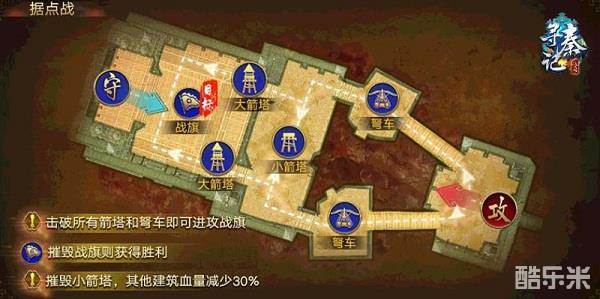 2、 摧毁全部箭塔、弩车,方可攻击守方战旗。