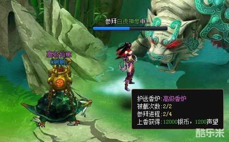 当上香4次后算任务完成,交付NPC获得奖励,运送越高品质的香炉,任务完成后所获得的修为银币越多。中途过程中其他玩家可对其进行“劫香”。一轮仙龟拜佛最多只能被劫两次。