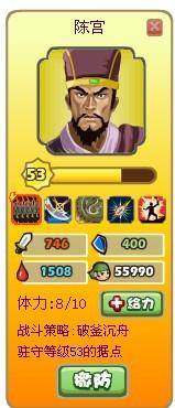 胡莱三国陈宫武将技:草木皆兵(天生技能)在士兵对战阶段,有40%的机率造成地方某种士兵当前总量5%加上少量伤害。