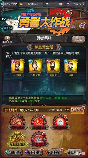 随着八神庵的入驻,《勇者大作战》拳皇黄金组的羁绊也随之圆满。当玩家将特瑞、草薙京、不知火舞、八神庵同时镶嵌到羁绊中时,即可获得攻击+500、血量+3000的属性提升。是不是很激动呢~