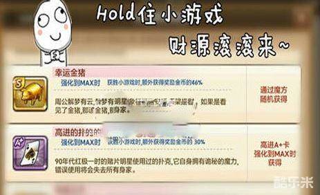 天天富翁幸运金猪和高进扑克这两款幸运道具的功能都是针对小游戏而设定的,将其强化至MAX,按比例增加小游戏获胜所获得的筹码数量,其中幸运金猪最高可增加获胜筹码的百分之四十六。
