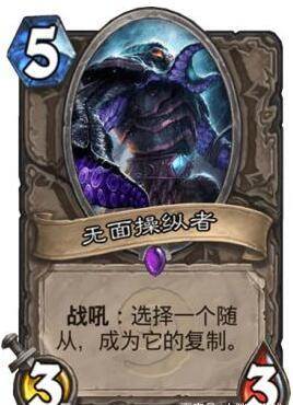 1.无面操控者。在无面系列中,有两只无面是具有复制能力的,它们分别是无面蹒跚者和无面操控者,但能变成其他随从的只有无面操控者。它们有相同点也有不同点,相同的是它们都是中立紫卡,而它们不同的地方在于,无面蹒跚者只能复制己方随从的生命值和血量,但具有嘲讽效果,费用也低一些,而无面操控者可以变成场上的任意一个随从。