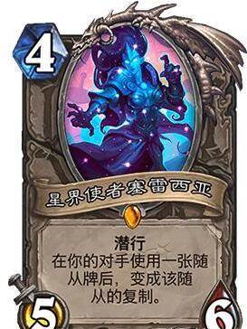 3.星界使者赛雷西亚。赛雷西亚和其他模仿大师最不一样也是最特殊的地方在于,赛雷西亚自带潜行效果,不过赛雷西亚的复制条件非常的苛刻,是必须对手打出的随从才能复制,这样只有等对手打出一张高质量的随从再打出赛雷西亚,否则复制低质量的随从会比较亏。这张卡在当今版本算是一张冷门卡,但大胖相信它总有一天会成为一套卡组中的key牌的。