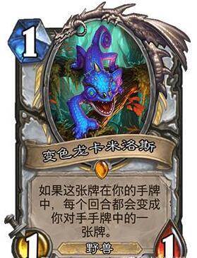 5.变色龙卡米洛斯。变色龙可谓是模仿大师中最厉害的一位了,因为它不仅能复制变成其他的随从,它还能够变成法术牌、武器牌设置英雄牌。