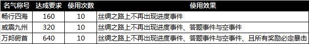2.名气称号效果有次数限制,每在丝绸之路上使用一次则减少一次;