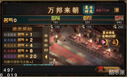 活动内容:活动期间,玩家通过发起请柬获得不同国家的进贡来获得不同数量的丝绸、丝绸锦囊或招商令奖励,以及提升一定的名气,当名气达到指定值时,获得名气称号。