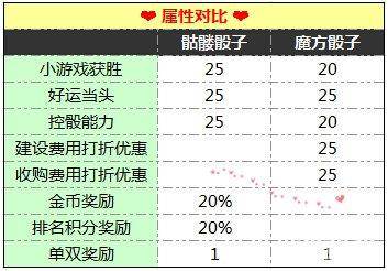 属性分析:魔方骰子拥有游戏中的建设和收购费用打折,而骷髅骰子拥有后期的金币和排名加成。各有所长,控骰能力上骷髅骰子是25点,而魔方骰子只有20点,介个就只能靠别的方面来弥补了。不过个人还是偏向魔方骰子,毕竟能赢才是王道嘛。