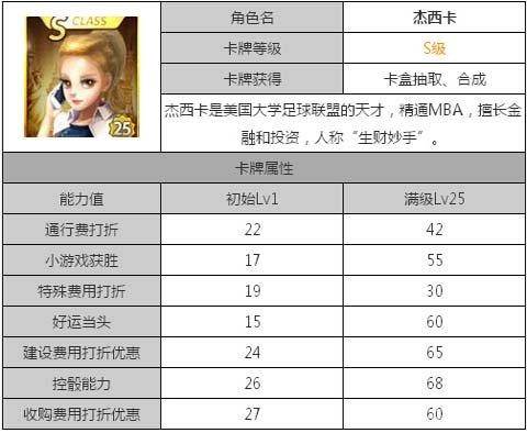 在重点属性方面,小编也只能感叹她实在牛叉,通行费用打折42点,虽然不比宙斯的53点高度,但在一众S卡中也算中规中矩,值得一提的是后四项重点属性:好运当头60点、建设费用打折65点、控骰能力68点、收购费用打折60点,是目前所有S卡中唯一一张后四项均在60点以上的噢!