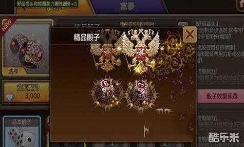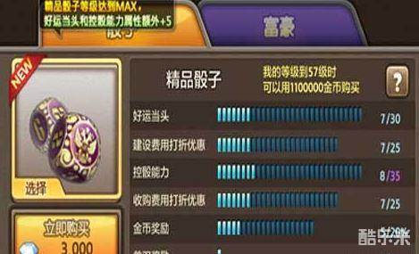 加成主要为:好运当头25点、建设费用打折25点、控骰能力30点、收购费用打折25点、金币加成20%,单双奖励1,相对扑克骰子来说把小游戏获胜替换成实用价值更高的好运当头,控骰能力上升了5点,排名积分加成换成金币加成,总体属性来看应该是目前所有骰子中最好的!